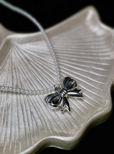 گردنبند زنانه مروارید با پلاک پاپیون استیل رنگ ثابت