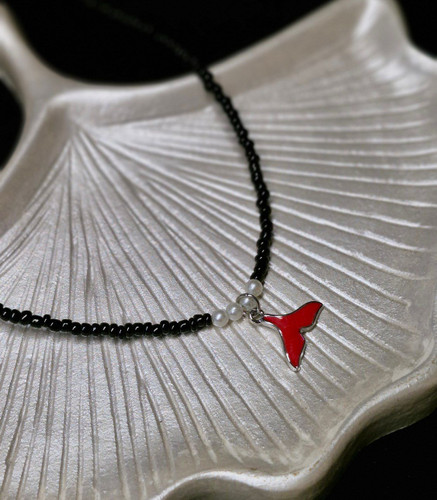 گردنبند زنانه منجوق مشکی با پلاک دم وال قرمز