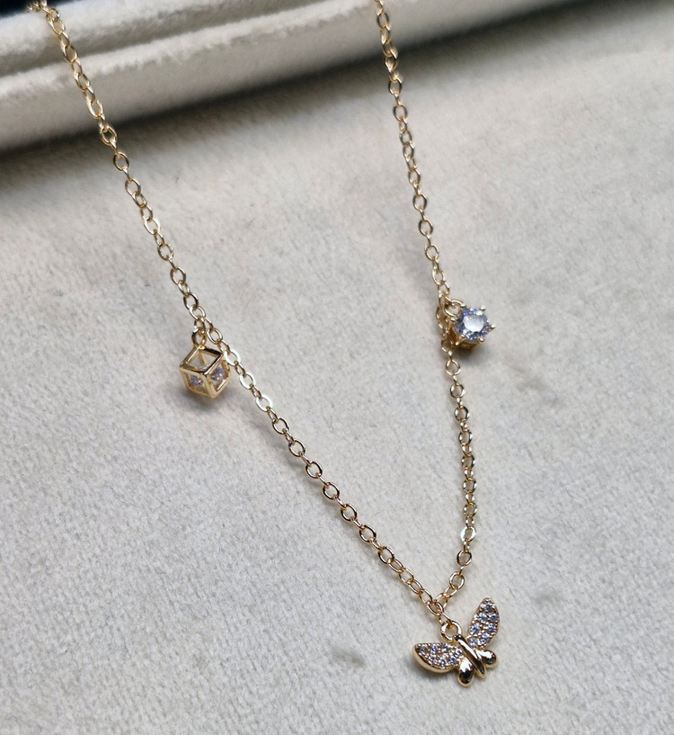 پابند زنانه آویز مکعب و پروانه و نگین تک نگین کاری شده از برند ژوپینگ ، طول پابند همراه با قفل 28cm و اندازه پلاک ها بین 0.5 تا 1 cm، رنگ ثابت و ضد حساسیت ، اختلاف در اندازه گیری تا 2،3 میلی متر امکان پذیر است