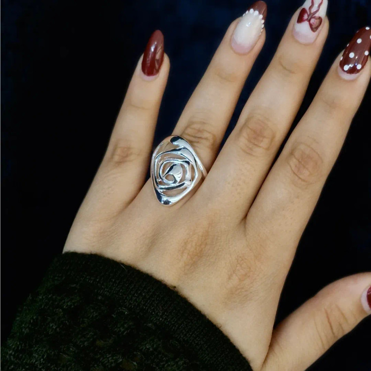 انگشتر استیل آبکاری نقره که با عطر در تماس نباید قرار گیرد و قابلیت تنظیم سایز دارد.